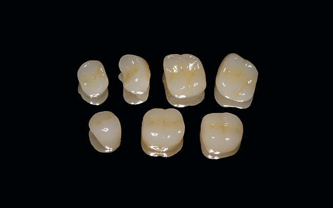 The in-office CAD/CAM restorative system was chosen because of its high success rate18 and for its esthetic properties, inherent strength, and fracture resistance of the porcelain blocks used after oven glazing.19 After the optical images of the preparations were obtained, the restorations were fabricated using the CEREC 3D Correlation mode. The Correlation mode takes the preoperative condition, reproduces it over the preparations, and allows it to be further modified by the clinician to obtain the desired occlusal and esthetic result. After the restorations were milled, they were stained and glazed in a porcelain oven to obtain the desired surface gloss (Figure 6). Preparing the internal aspect of the restorations involved micro-abrading with a micro-ether containing 50- m m aluminum oxide powder to prevent damage to the margins, and rinsing with water and drying for approximately 5 seconds. A 9.5 % hydrofluoric acid gel was applied for 1 minute, rinsed with water for approximately 20 seconds, and dried thoroughly. Before the advent of resin adhesive products, cements typically were formed by an acid/base reaction in which the acidic liquid and basic powder were combined; the powders commonly were either zinc oxide or aluminosilicate glasses while the liquids were phosphoric acid, polyacrylic acid, or eugenol.7