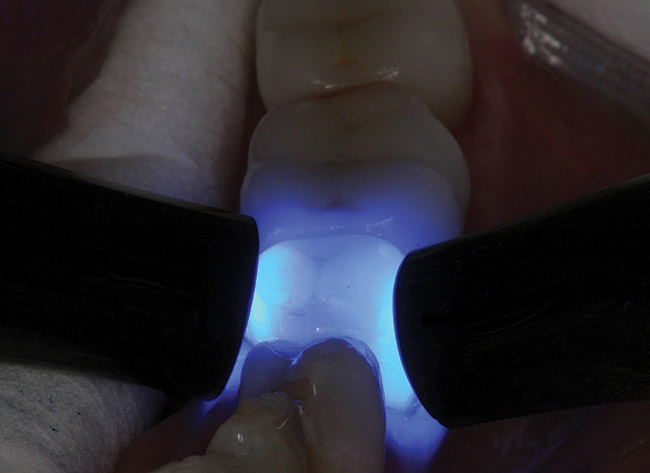 Tissue management was then obtained by the application of the same putty-type retraction system (Figure 8). After 2 minutes, the putty retraction material was thoroughly rinsed away with air/water spray and dried. The teeth were then cleaned again with 2% chlorhexidine, rinsed, and dried without reaching desiccation.20 The restorations were filled with a dual-cure resin cement system, Maxcem™ (Kerr Corporation, Orange, CA), seated, and remained undisturbed for 90 seconds before light-curing (Figure 9).6 This waiting period was mandatory for the self-adhesive chemistry in the cement to be fully effected. The cement reached a gel state and was easily removed with a handscaler (Figure 10). To ensure no movement of the restorations while cleaning cement interproximally, the restorations were tacked down mid-cervically on the buccal with a 4-mm turbo tip in a LED curing light. Interproximal cleaning was accomplished with waxed floss (Figure 11) and final curing was performed on both the buccal and lingual aspects with two LED lights simultaneously for 20 seconds (Figure 12), followed by occlusal curing for 20 seconds. Marginal finishing was performed with an 8-fluted carbide bur and composite points and cups. Interproximal finishing involved using medium- and fine-composite finishing strips. Occlusion was checked and slight adjustments were performed before the final polishing of these areas with porcelain polishing points. The final results are shown in Figure 13 and Figure 14.