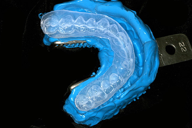 The mandibular metal tray is filled with heavy-bodied material and placed over the study model that has the vacuum-formed plastic spacer (Figure 5). After setting, the tray is separated from the study model (Figure 6) but the vacuum-formed plastic spacer should remain on the study model. If it remains attached to the impression material, then it should be removed (Figure 7). The vacuum-formed plastic spacer provides a uniform amount of space throughout the entire impression and controls the thickness of the wash material. After the tooth preparation is completed, the tray can be filled entirely with the light-bodied material and placed in the mouth (Figure 8). The heavy-bodied material that was in contact with the study model 1 mm beyond the gingival margin and the buccal vestibule now provides the path of insertion that correctly orientates the tray in the mouth exactly as it was on the study model. This technique uses a rigid, well-adapted tray with a uniform amount of spacer, resulting in a uniform amount of light-bodied material with a smaller amount of polymerization shrinkage (Figure 9 and Figure 10).