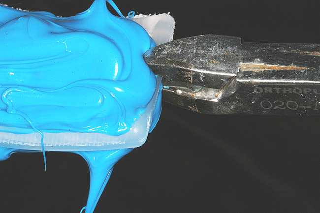 Using a borderless plastic tray (eg, Bite Registration Tray, Kerr Corporation, Orange, CA; Figure 11), a heavy-bodied material is loaded on both sides of the tray. The crossing member of the tray in the distal portion is severed with a small wire-cutting tool (Figure 12). This step will allow both sides of the tray to move independently of each other when the patient closes their mouth, eliminating any possible tray recoil. The separation in the distal portion of the tray prevents impingement on the maxillary tuberosity, thus allowing maximum intercuspation. Once the heavy-bodied material is set, the tray is removed from the mouth (Figure 13). The manufacturer’s recommended set time should be observed with use of a timer. The preparation side of the impression is dried and all interseptal material that may interfere with complete reseating of the tray is removed, then the light-bodied material is syringed into the entire length of the preparation side of the impression (Figure 14). There is the possibility of creating a “stepped” occlusal plane when the light-bodied material is syringed only in the preparation area of the impression.50 After completion of the second step, a detailed impression of the prepared area and a minimal amount of wash material covers the entire length of the impression (Figure 15).