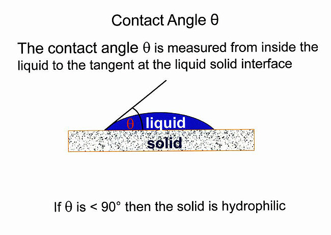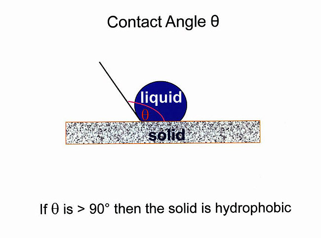 Dentin bonding involves adhesion. There are three types of adhesion: chemical, van der Waals interaction, and mechanical (either micromechanical or macromechanical). Adhesive systems can use the types of adhesion either individually or together, depending upon the manufacturer. Chemical adhesion involves bonding at the atomic or molecular level. There is an ionic bond to the mineralized component of the dentin and a covalent bond to the organic constituents of the dentin. This type of bonding occurs with glass ionomer materials. The van der Waals interaction is based on an electrostatic or dipole interaction between the bonding agent and the substrate. The strength of the dipole interaction is directly measured by the contact angle. The contact angle is the angle formed when a liquid is placed in contact with a solid. The contact angle is a good indicator of the wettability of solid by a particular liquid5 and whether a solid is hydrophilic or hydrophobic (Figure 1 and Figure 2). The highest bond strengths are obtained when van der Waals forces are optimized. This is the primary bonding of resin to dentin and enamel. Micromechanical bonding is based on retention by the blocking of movement of the restoration (also known as “luting”). Adhesion is an attempt to minimize the space between the tooth structure and the restorative material.