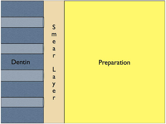 Preparation of the dentin surface for bonding starts with etching. The total-etch technique uses phosphoric acid as the etchant. Etching the dentin removes the smear layer and creates a demineralized zone of dentin, exposing collagen fibrils. This creates a porous surface allowing for primer penetration. Application of the etching material for too long a period of time on the dentin can lead to a demineralized zone that can not be filled with resin and is a potential cause of postoperative sensitivity. The pH of self-etching and self-priming adhesives systems is low enough to etch through the smear layers and underlying dentin without a separate etching step.10