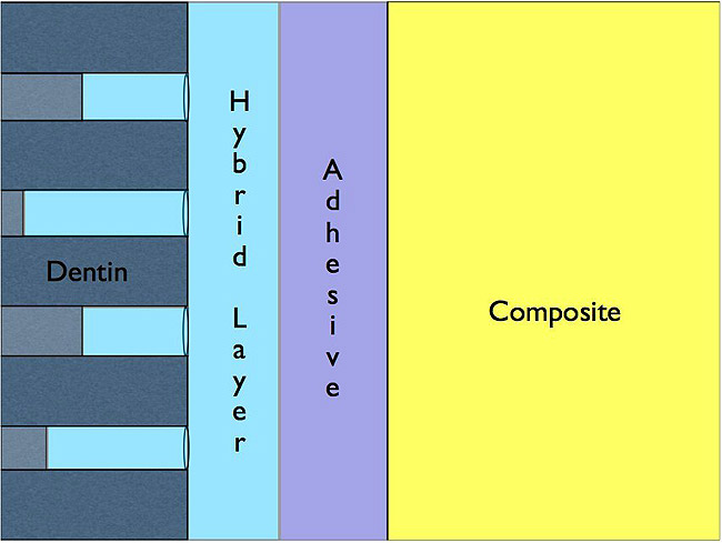 Bonding agents are hydrophobic, dimethacrylate oligomers that are compatible with the monomers used in the primer and the composite.10After placement of the primer, the bonding agent is applied to the treated dentin surface and light cured. This leaves an air-inhibited layer on the surface of the treated dentin. Once the composite is placed, air is displaced and with light curing, copolymerization takes place: adhering the composite to the dentin surface.10