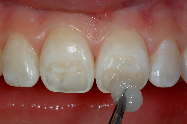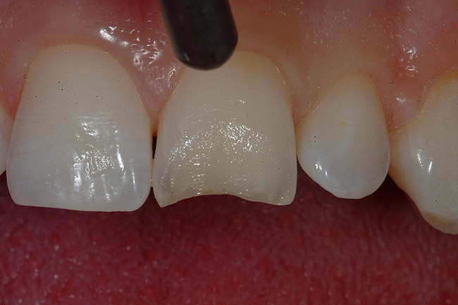 The success of this procedure will depend on having a sufficient amount of remaining ceramic to provide micromechanical retention for the porcelain veneer that will be placed to repair the fractured surface. Once the preparation is complete, a master impression is taken and the tooth is provisionalized using direct composite resin that is “spot-etched” to the ceramic surface. Supplying digital photographs of the existing bridge, particularly the adjacent central incisor, will aid the technician in the placement of internal effects and incisal translucency.