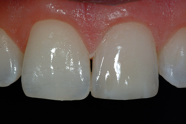After the preparation is etched with 37% phosphoric acid for 15 seconds (Figure 4), the etchant is vigorously rinsed off for at least another 15 seconds or more. The preparation is then thoroughly dried (enamel and dentin), then the dentin is rewetted with a desensitizer (AquaSeal B™: AcquaMed Technologies, Chicago, IL; Gluma®, Heraeus Kulzer, Armonk, NY) (Figure 5) and high-volume suction is placed within a millimeter of the prepared surfaces for 2 seconds (Figure 6), and then removed. This will create a perfect, moist surface to place a hydrophilic primer, not too desiccated (collapsed collagen), and not too moist.7 A fifth-generation dentin bonding adhesive (OptiBond® Solo Plus™: Kerr Corporation, Orange, CA; Adper™ SingleBond, 3M ESPE, St. Paul, MN; Prime & Bond® NT™, DENTSPLY International, York, PA) is copiously placed with a microapplicator and agitated into the prepared surface (Figure 7). After air-thinning and evaporation of the solvent (ethanol), the adhesive is light-cured according to the manufacturer’s instructions. Figure 8 shows the completed restoration of the facial surfaces of tooth Nos. 8 and 9 (Herculite® Ultra: Kerr Corporation; Kalore™, GC America, Alsip, IL; Esthet-X® HD: DENTSPLY International; Amaris®, VOCO America, New York, NY; Rok, SDI).