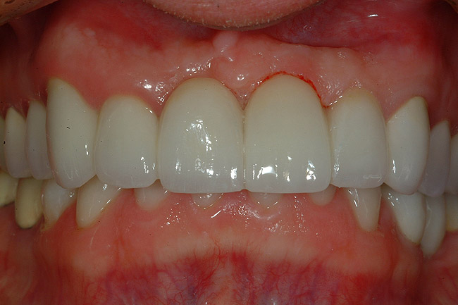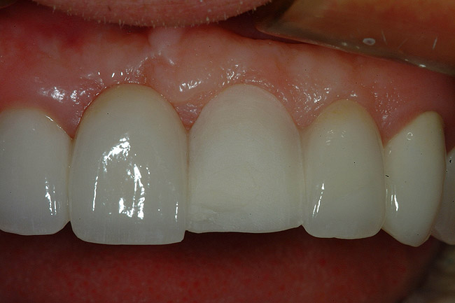 The restoration is then placed on the prepared surface of the tooth and fully seated expressing the excess resin cement (Figure 20). A number 2 Keystone brush (Patterson Dental, St Paul, MN) is used to carefully remove the majority of the excess resin cement, being careful not to move or dislodge the restoration (Figure 21). Reseating the veneer with finger pressure intermittently during the resin cement “clean up” will ensure that the restoration remains in the proper orientation. A large cotton ball in a cotton forceps can be used to carefully remove the remaining resin from the surface of the ceramic material. Once the majority of the resin cement is removed, the restoration is light-cured for 60 seconds. Figure 22 shows the repaired tooth No. 9 using a porcelain veneer bonded to existing porcelain. The esthetic match of the ceramic is perfect as the restoration is undetectable. The bond of ceramic-to-ceramic is very strong and this “repair” should last for years to come. Certainly a repair in this fashion is preferable to remaking the entire bridge and the result is excellent.12