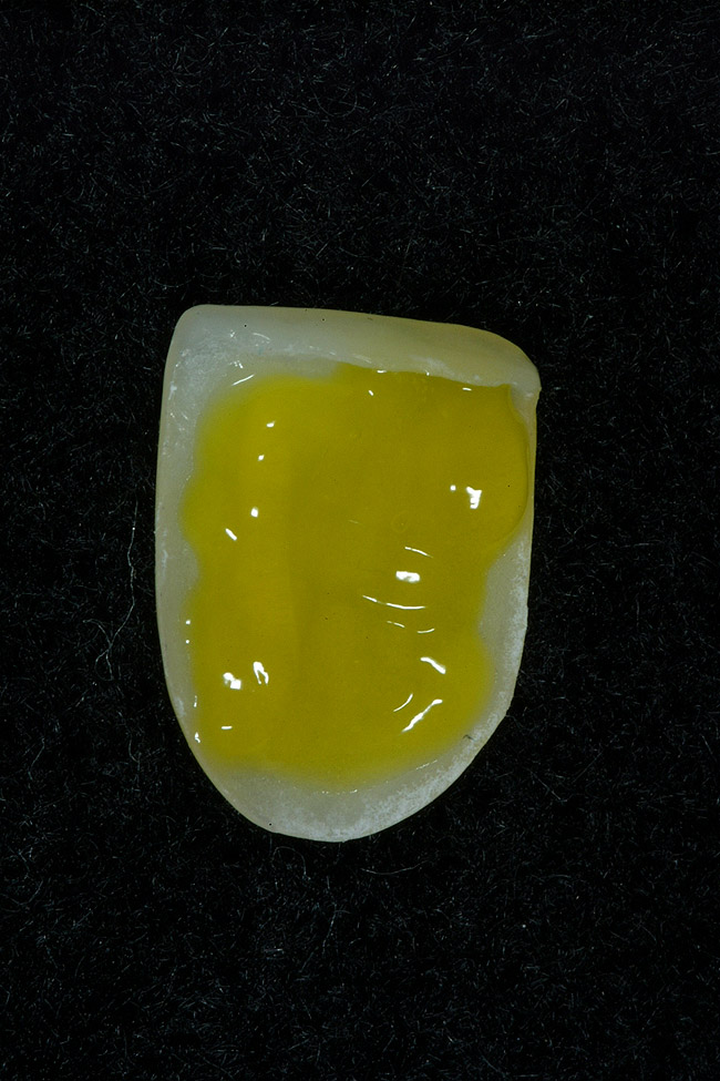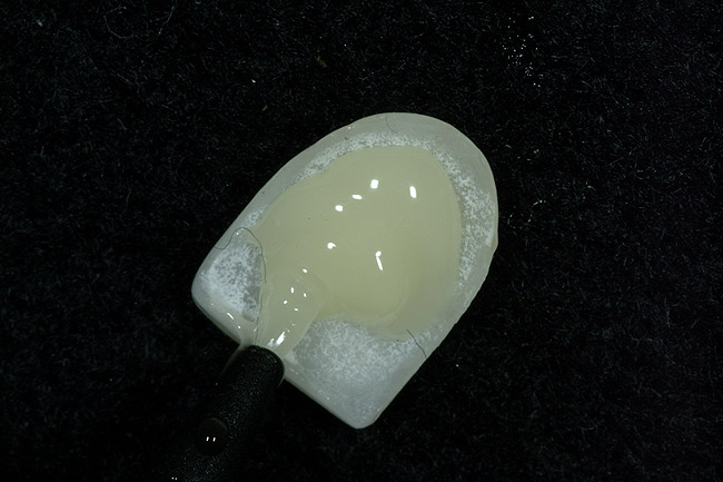 After removal of the provisional direct resin temporary, the porcelain veneer is checked for color match and marginal fit. The best way to evaluate color is to try on the veneer with water only and photograph using a digital camera. If the color and fit is good, the restoration is ready for placement. The first step is to etch the porcelain veneer and porcelain surface of the preparation (Figure 18) with hydrofluoric acid for 60 seconds then thoroughly rinse for an additional 60 seconds. Next, both ceramic surfaces are silanated and air-dried. After the silanation process, a fifth-generation dentin adhesive (OptiBond Solo Plus; Single Bond; Prime & Bond) is copiously applied, scrubbed into the surface of the ceramic using a microbrush, air-dried, and light-cured for 20 seconds (Figure 19). A clear (untinted) composite resin cement (NX3 Nexus® Third Generation, Kerr Corporation; Calibra®, DENTSPLY International; RelyX™ ARC, 3M ESPE) is applied to the internal surface of the porcelain veneer.