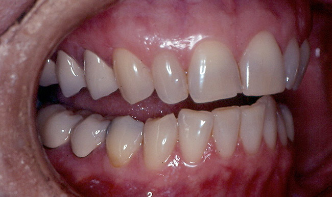 Treatment for this patient began with evaluation of the patient’s joint position. It was determined that the patient had a centric relation/maximum intercuspation discrepancy. Occlusal equilibration (coronoplasty) allowed establishment of stable, even holding contacts with the condyles in centric relation.