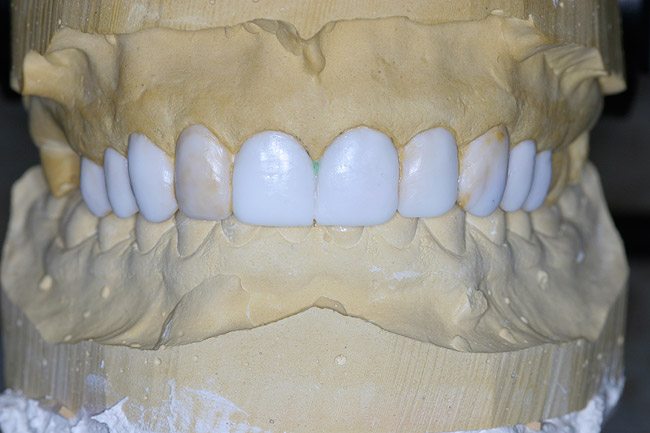 Further orthodontic intervention was declined by the patient. Therefore, to meet the patient’s esthetics goals and the necessary functional requirements, a restorative option of stacked porcelain veneers was pursued. During the treatment-planning phase of the restorative process, a diagnostic wax-up was created to allow the buccal cusps of the premolar to mimic the contour of a canine. This allowed immediate posterior disclusion, which decreased the activity of the elevator muscles. Bis-acrylic temporary restorations (Fill-In, Kerr) were created off the diagnostic wax-up, thus allowing a period to test the new anterior guidance (Figure 9). After approximately 6 weeks of the patient testing of the new functional contours, impressions of the provisional restorations were taken. Stents were then made from these models to allow duplication of the provisional contours in the porcelain restorations (Figure 10 and Figure 11).