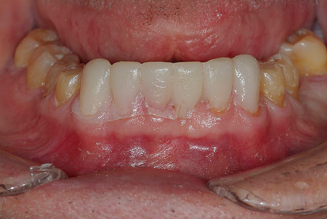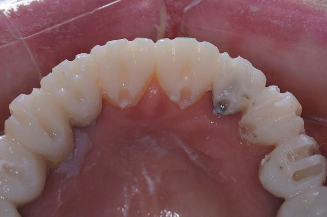 A problem with all matrixes is that the resin may not exit rapidly enough to prevent being trapped when the matrix is seated. This trapped resin prevents complete seating and will introduce error to the provisionals. Routinely, these provisionals will be high in occlusion and must be aggressively adjusted. These adjustments can destroy the precision of the work done in the laboratory. A possible solution is to create deep escape vents in the matrix beyond the free gingival margin (Figure 16). Multiple vents are required in a full-arch provisional. This allows an easy escape for the excess resin and allows more ideal positioning. Dentists may verify seating by evaluating the thickness of resin captured on the palate in the maxilla or on the tooth stops in the mandible (Figure 17 and Figure 18). If an excess amount of acrylic remains, then the provisional is high and the vertical dimension and occlusion of the wax-up have not been transferred. Rather than grinding resin haphazardly, the provisional should be remade with more vents cut to improve seating.