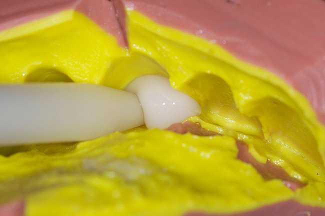 After creating casts of the provisionals for the laboratory, the sectional bite technique calls for the removal of a portion of the provisionals and fabrication of an inter-occlusal record. Usually practitioners begin in the anterior, making it easier to verify when the registration is reseated properly. Once that section is recorded, it should be trimmed to eliminate tissue contact and deep details. Both may keep the registration from reseating properly. The remaining provisionals are removed, the sectional inter-occlusal registration is reseated, and the preparation reduction verified (Figure 26 through Figure 28). Registration material is then placed over the remaining sections as the patient returns to a closed position. There are two important technique notes. First, the new registration material should not be allowed to overlap the existing registration. If the material overlaps, it will alter the vertical orientation of the casts and create instability in the mounting. (Figure 29) If necessary, practitioners should make the registration in three distinct sections to prevent this error. Second, the patient is instructed to bite half-hard into the matrix. Without a solid posterior stop, a firm bite will over seat the condyle and the occlusion will be impacted. A half-hard bite will minimize the condylar displacement and maintain a proper inter-occlusal relationship (Figure 30 and Figure 31).