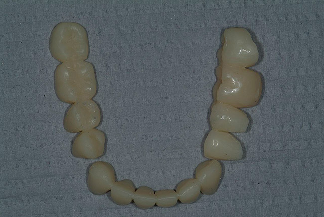 The mandibular teeth are then waxed into a proper occlusal relationship. The mandible, however, does not have the advantage of the palate as a stop for a provisional matrix. Once the teeth are prepared, the dentist lacks a solid bilateral stop to verify positioning of the matrix. This makes it extremely difficult to reproduce the wax-up intraorally. One solution is to complete the mandibular wax-up in stages. If the mandibular anteriors are created first, then a matrix can be produced to complete the anterior provisionals using the posterior teeth as the stop (Figure 13). The posterior teeth are then waxed and a complete arch matrix fabricated. This allows the mandibular anterior teeth to be prepared and provisionalized in centric relation at the vertical dimension of the wax-up (Figure 14). The posterior teeth can then be prepared and the anterior provisionals are used as the positioning stop for the posterior provisionals (Figure 15).