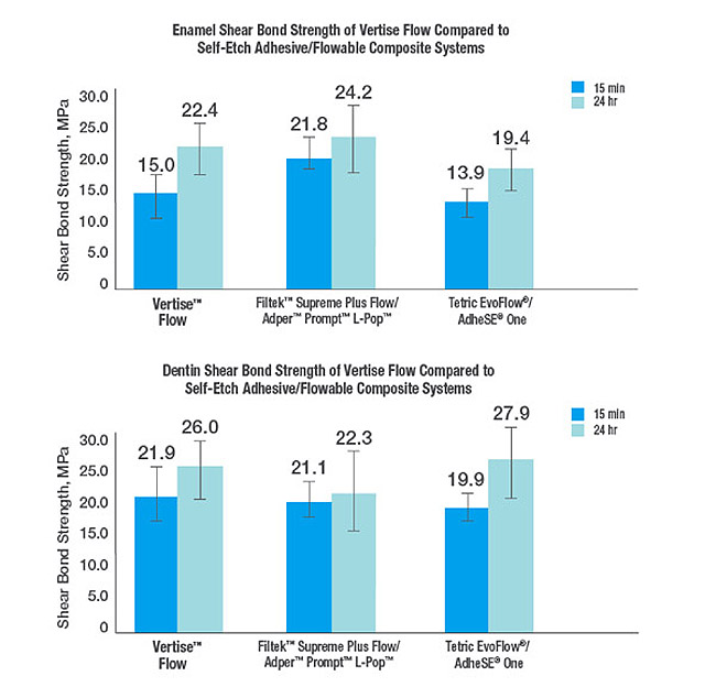 Studies of Vertise Flow shear bond strength to dentin and enamel compared favorably with other self-etch adhesive/flowable composite systems. Vertise Flow’sbond strength to enamel and dentin can exceed 20 MPa.9