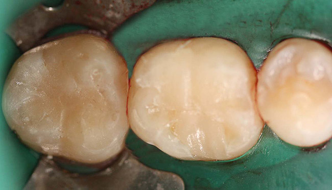 Case 2 (Figure 7 through Figure 11) depicts a series of defective amalgams on the first molar and biscupids. The amalgams were removed, the decay was excavated and cracks were eliminated. Bonding was completed on dentin and enamel. The teeth were matrixed and composite was built with layering techniques. To control contours, each tooth was completed individually, and then the next one was done. Composite was shaped, occlusal adjustment was completed, and final polishing was done.