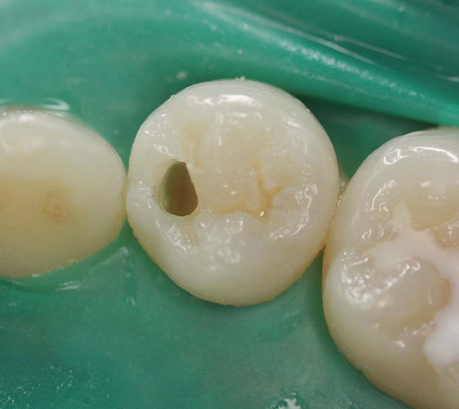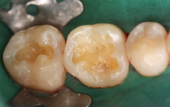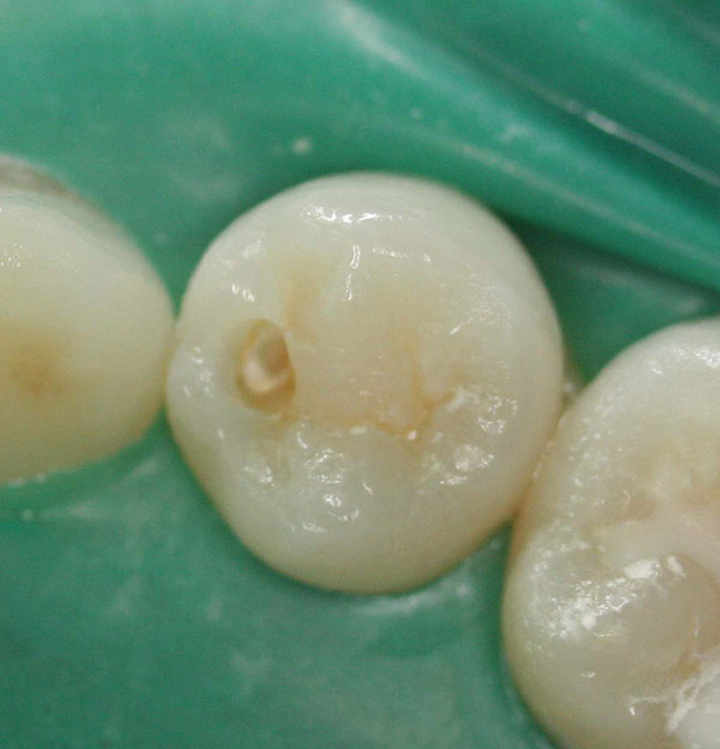 Case 3 (Figure 12 through Figure 15) on x-ray reveals a cavity in the mesial pit of the mandibular first bicuspid. Access was gained, caries removed, and bonding completed. A difficult five-wall defect required that small increments of composite be placed.