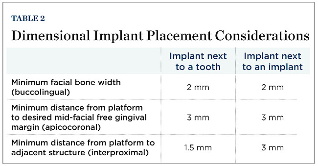 Based on the tenets discussed above, implant placement should adhere to several morphologic guidelines, all of which center around the notion that the fixture must follow the path of the ideal emergence profile (ie, be prosthetically friendly) (Table 2). Use of a surgical guide aids the practitioner in this mission, but even with a guide, the clinician must at all times have a kinesthetic sense of where the implant needs to be. Insertion in the anterior zone favors palatal over buccal angulation because a platform tilted facially may thin the alveolar plate, thus promoting recession, and also result in a tooth that appears to protrude or be discolored due to abutment visibility through the crown or mucosa. Palatal orientation, with maintenance of at least 2 mm of buccal bone, offers the restorative dentist more flexibility with the emergence profile and resists tissue resorption.8,18 Similarly, the apicocoronal position of the implant at the buccal influences these factors. Natural teeth exhibit a free gingival margin-to-osseous crest distance of 3 mm at their mid-facial aspects, and this observation applies to adjacent implant restorations as well. To complement the facial gingival contour of its neighbors, the platform of the implant should lie roughly 3 mm apical to the desired mucosal margin of the crown, which should line up more or less with the free FGM of the existing anterior dentition.18,26,27 A platform located further apically but supracrestal or at the crest may cause a deep, hard-to-clean peri-implant pocket to form; one that lies subcrestal may initiate buccal bone loss and subsequent soft tissue recession in a patient with thin, non-augmented buccal bone. Even so, a more apically situated implant provides plenty of room for shaping an archetypal emergence profile; the same cannot be said of a more coronally located implant (< 3 mm from platform-to-mucosal margin), which stymies any normal-appearing emanation of the crown from the maxilla. Finally, the interproximal bone and its anticipated overlying papilla depend on the mesiodistal space between the implant platform and the adjacent tooth or implant; the wider the distance, the greater the odds of bone retention and papillary formation, though the papilla expected are more likely to be short and squat than long and thin.17,21
