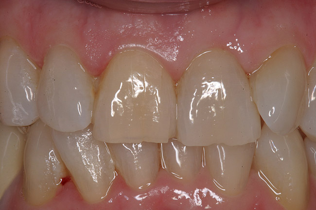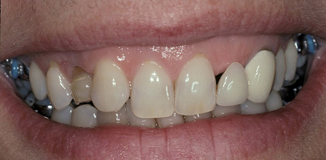 Single implants, or those located between two natural teeth, typically require a minimum of 1.5 mm of bone between the edge of the implant and the root surface.4 In the case of replacement of a lone maxillary central incisor, there should be a distance at least 2 mm to 2.5 mm between tooth and fixture, as the peak of bone sandwiched between centrals is customarily wider. The space between an implant and another should be even farther apart; this scenario requires no less than 3 mm of interproximal bone. Two maxillary central incisor implants ought to be at least 4 mm to 4.5 mm apart to support the naturally wider configuration in this area. Taking into account the information above and considering the natural width and emergence profile of teeth, the standard implant diameter used for lateral incisors is less than 4 mm, while the diameter used to substitute central incisors and canines does not typically exceed 5 mm.6 Obviously, the recommended diameter varies depending on the individual patient’s dental idiosyncrasies. Some patients simply do not possess enough mesio-distal crestal bone or room between the roots for esthetic conventional implant placement. Replacement of a failing peg-sized maxillary lateral incisor, for example, may require orthodontic movement to create sufficient interdental space (Figure 6, Figure 7 , Figure 8 and Figure 9). If the patient will not or cannot manage implant space creation, alternative therapies include restoration with a removable appliance, resin-bonded fixed prosthesis, or conventional fixed partial denture.