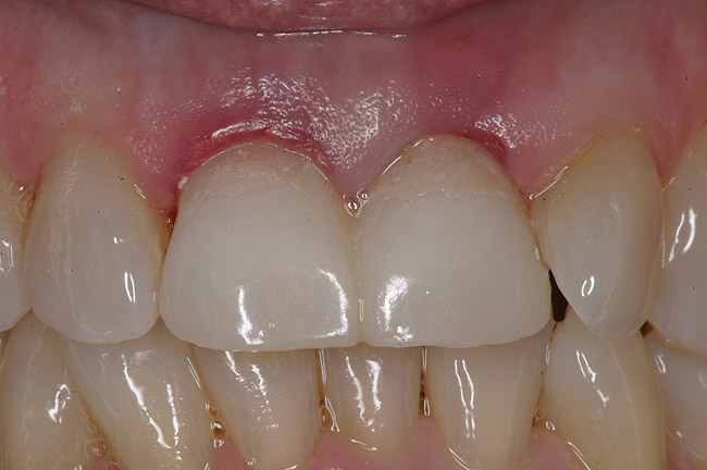 On the other hand, mimicking a thin/scalloped biotype proves taxing to even the most experienced clinical team, and more often than not, the dentist must forewarn the patient as early as possible about inconsistent cosmetic outcomes. Recall that the mean height of papilla adjacent to single implants is a bit less than 4 mm (3.85 mm).17 Accordingly, the prevalence of complete or nearly complete papilla fill (Jemt scores 2 and 3) around single implants is 100% when the distance between the contact point and crestal bone is less than 4 mm.17,20 Any increase in this distance dramatically reduces the chance of papillary fill; for example, if the contact point-to-bone space increases to 6 mm, there is only a 50% likelihood of full papilla. The projected papillary height between two implants is even shorter, closer to 3 mm (mean 3.4 mm).21 Thin tissue, especially if non-keratinized, provides another obstacle to ideal cosmetics because it tends to recede around restorations, becomes inflamed easily, and allows prosthetic margins to show through.22,23 Thus, a patient who has a thin/scalloped biotype with papilla frequently exceeding 4 mm in height may notice disparities in the soft-tissue drape (ie, black triangles, shortened papilla, longer teeth, and darkened or discolored marginal mucosa) around single and multiple implants compared to the existing dentition. The ability of the patient to accept these differences depends on the lip line and, needless to say, how fastidious about orofacial appearances he or she is. Increasing the width and volume of keratinized mucosa with an apically positioned flap, free gingival grafting, connective tissue grafting, or acellular dermal grafting prior, during, or after implantation, with earlier intervention being more favorable, improves general mucosal health and cosmetics at the buccal margin but cannot entirely convert a thin/scalloped biotype into a thick/flat one, especially in the critical interproximal regions.14,24 Even mucosal intervention begun as early as the time of tooth extraction, such as creation of a provisional with an ovate pontic extending 1 mm to 3 mm below the mucosal margin that aims to retain the gingival emergence profile of the original tooth, may not safeguard an intrinsically fragile tissue type.16,18,25 The treatment team must convince the patient to rein in his or her expectations, particularly if the plan includes multiple implants, and forfeit ideal soft tissue esthetics for high functionality or seek another restorative solution.